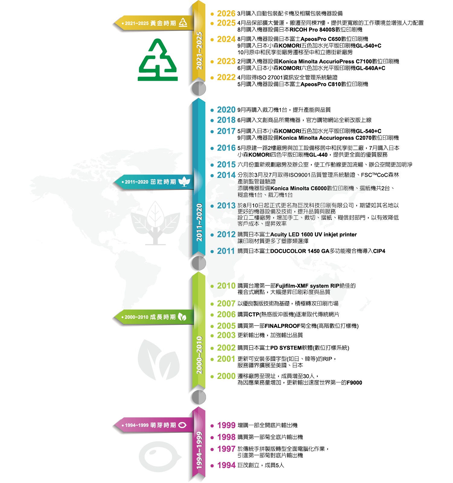 2010至2015年間除持續精進硬體設備,購入日本富士DOCUCOLOR 1450 GA多功能複合機導入CIP4、Acuity LED 1600 UV inkjet printer讓印刷材質除紙張外更多了塑膠類可以選擇、Konica Minolta C6000數位印刷機解決少量又要求品質的客戶需求,在人事方面增設手工、裁切、摺紙、糊信封等部門,並取得ISO9001、FSC™CoC驗證。軟硬體的雙向提升,巨茂的服務能力得以更加寬廣、更加深入。